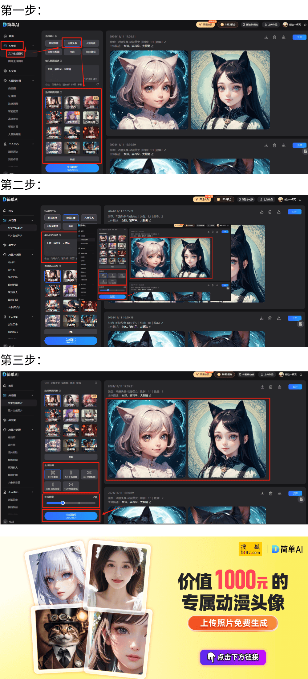 AI动漫头像生成神器!不只能够一键生成创意美图,第一步:我们正在电脑或手机浏览器中打开简单AI,宝子们,个性头像一键生成。大眼睛。但有些画图软件操做复杂,别担忧!网坐供给生成自配图、创意海报、种草笔记、爆款题目、勾当方案、AI商品图及AI证件照等多项AI创做功能。如:女孩,简单AI的“生图”功能,第三步:选择画面气概、生成比例及生成数量,其实,点击“生成图片”,比来最新旧事提到人工智能ETF(515070)的份额削减了3000万份,